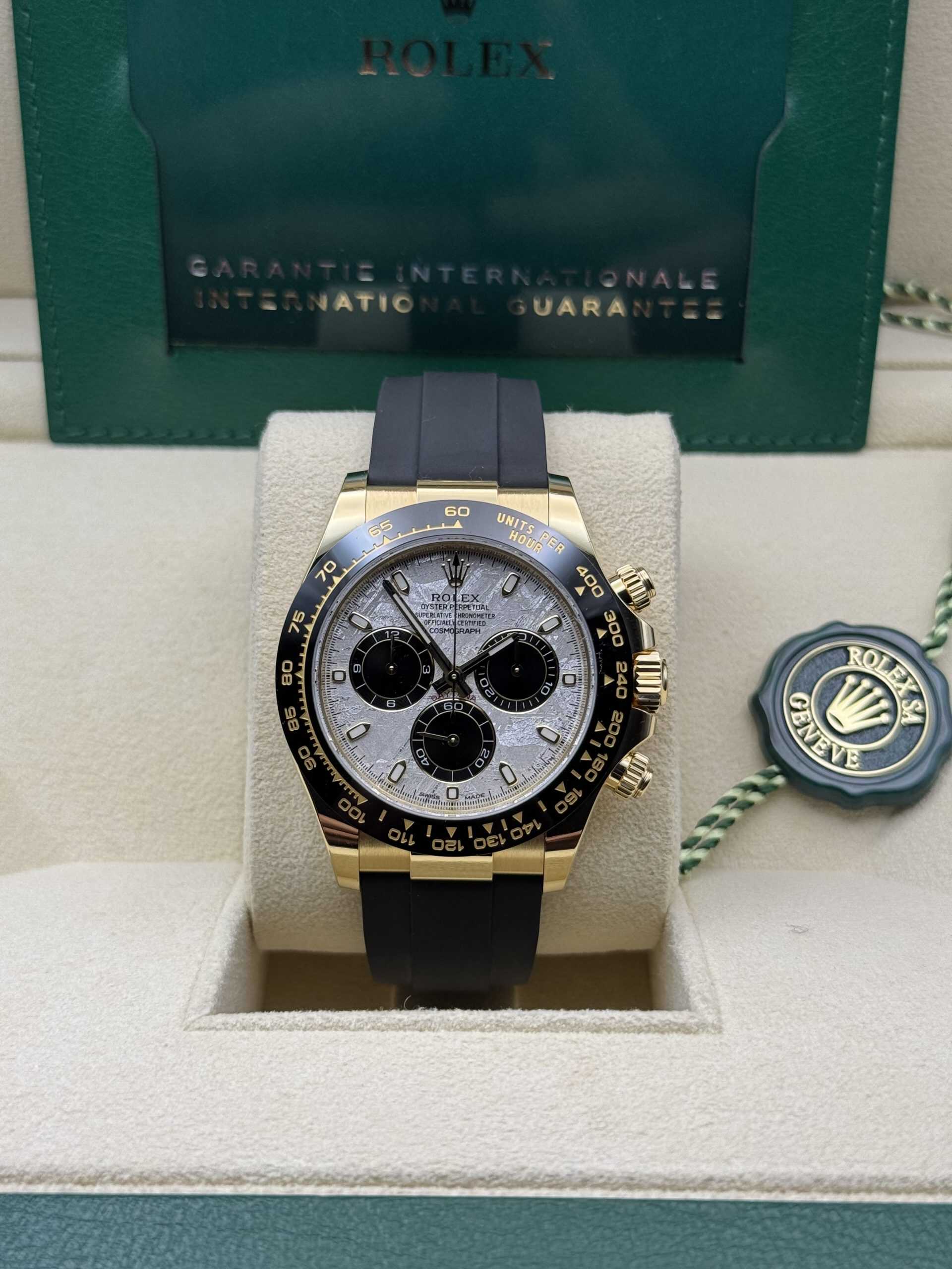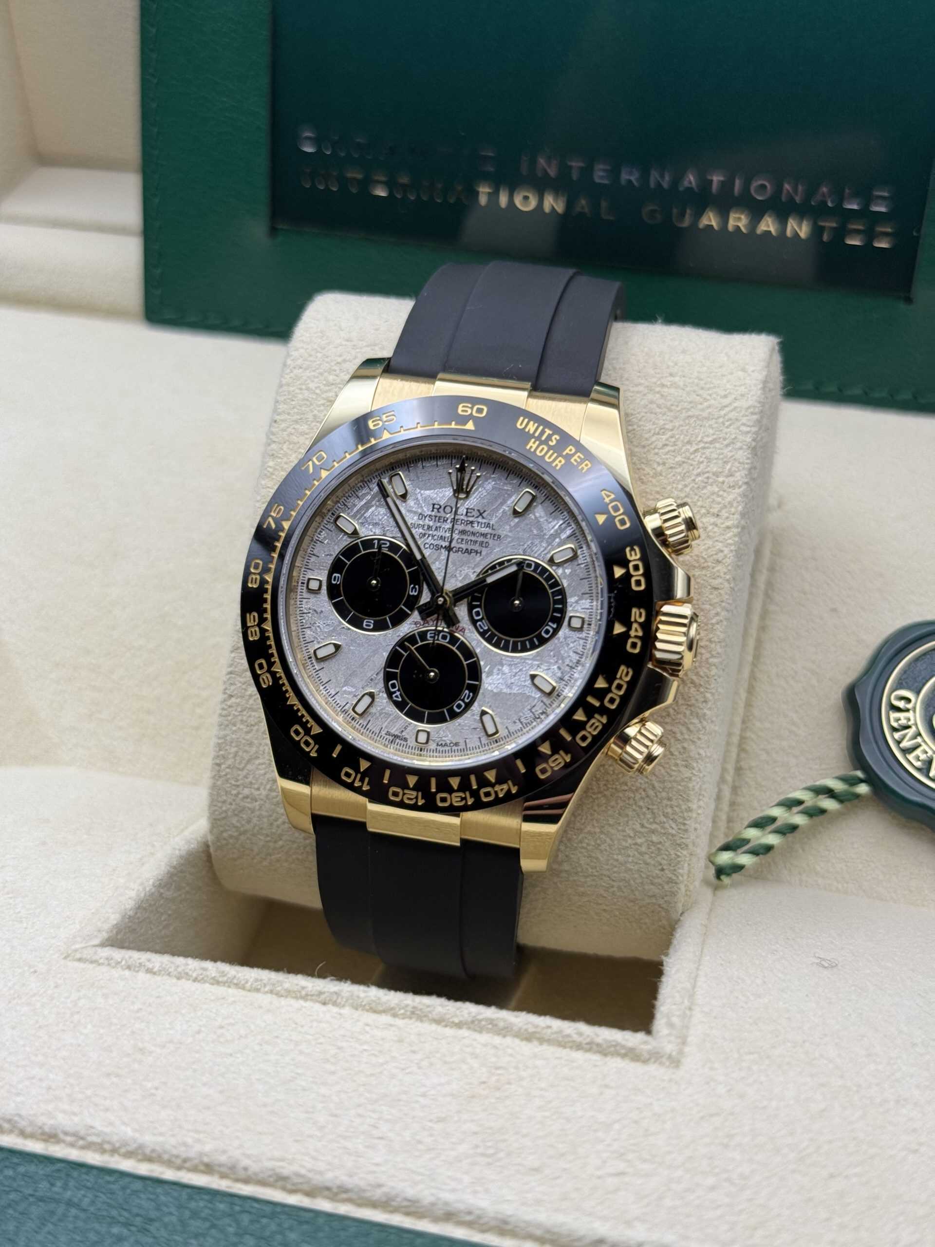 The standout feature of this Daytona is its mesmerizing meteorite dial, a unique and rare material that adds an extraordinary touch to the watch. The intricate patterns of the meteorite, combined with contrasting yellow gold sub-dials and luminous markers, create a striking visual appeal that is both sophisticated and distinctive. The black ceramic bezel enhances the sporty aesthetic, making it perfect for both casual and formal settings.