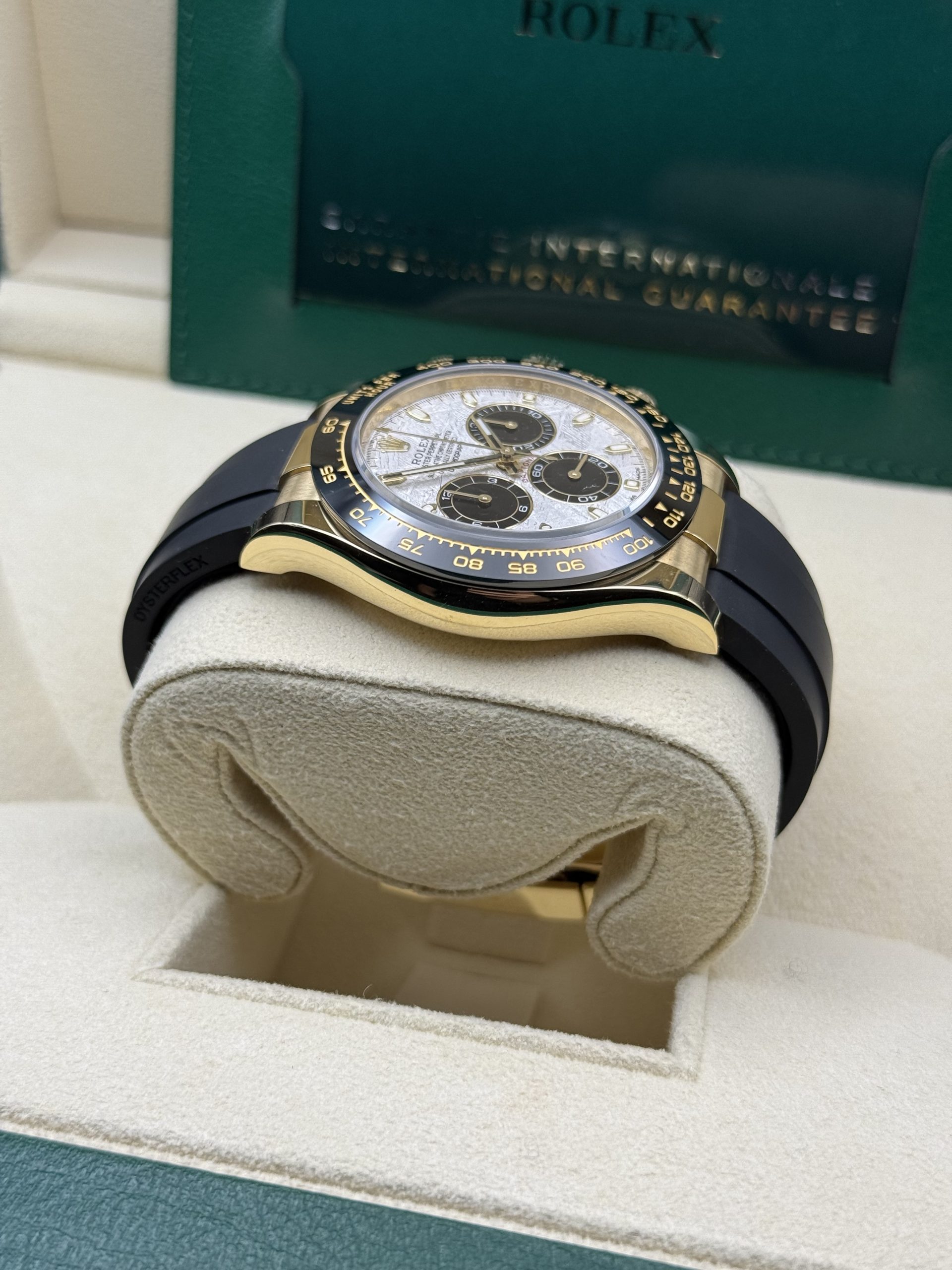 Equipped with Rolex’s renowned chronograph movement, the 116518LN ensures exceptional precision and reliability, making it an ideal choice for motorsport enthusiasts and everyday adventurers alike. The comfortable Oysterflex bracelet provides a modern twist, offering flexibility and durability while maintaining a luxurious feel.