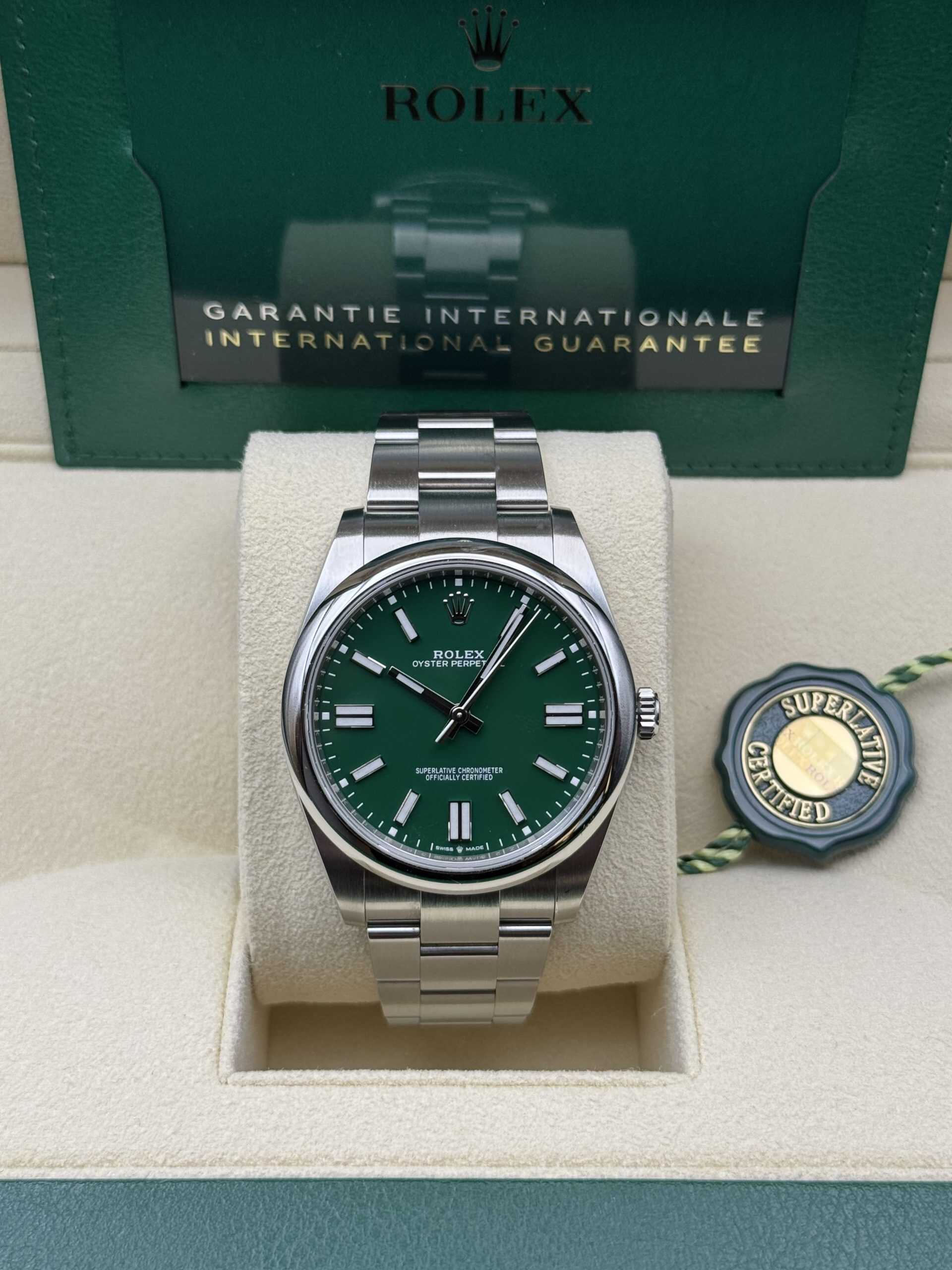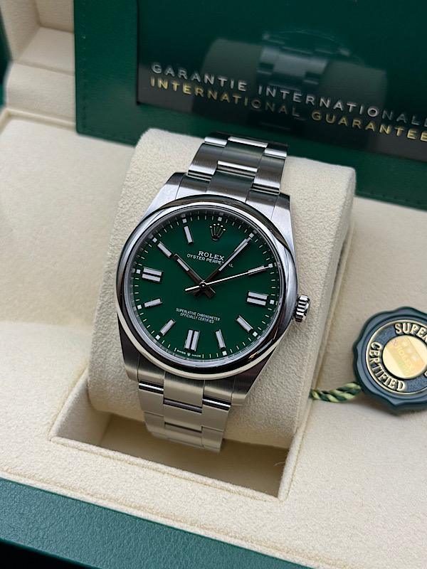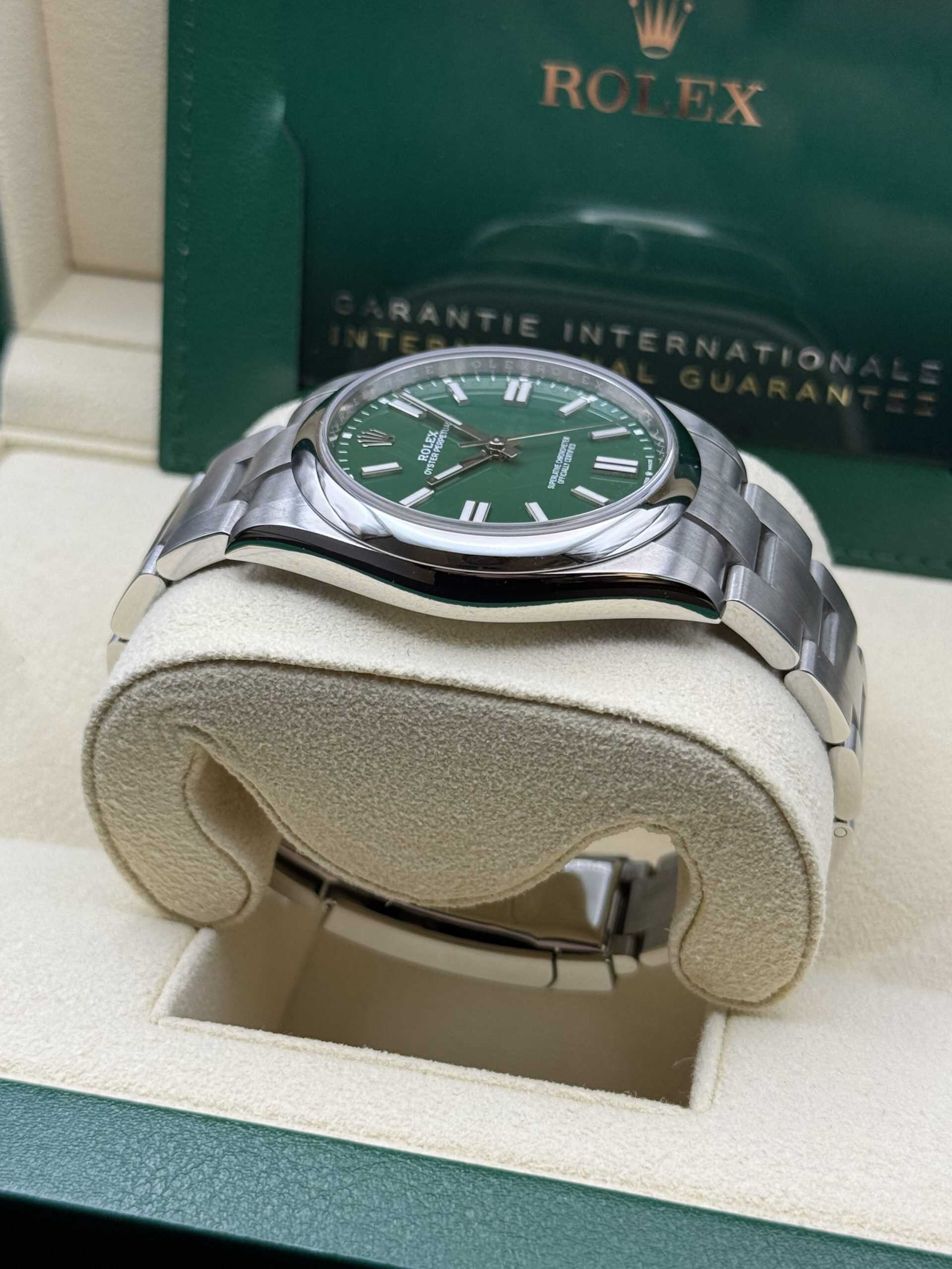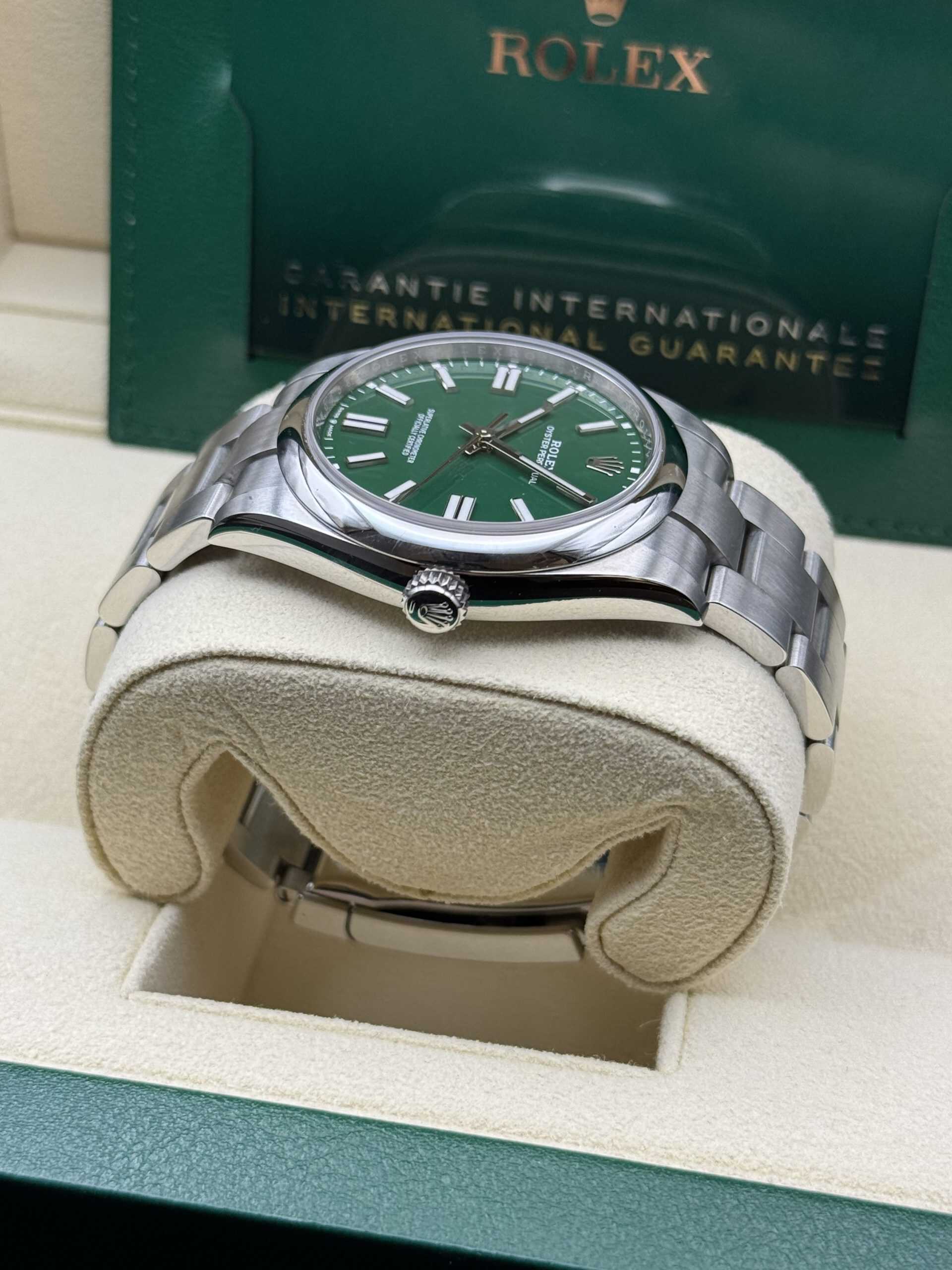 Powered by Rolex’s renowned automatic movement, the 124300 guarantees precision and reliability, embodying the brand’s commitment to excellence. The striking hour markers and hands are crafted from 18k white gold, providing a beautiful contrast against the vivid green backdrop. The Oyster Perpetual is not just a watch; it’s a statement of individuality and a celebration of timeless design.