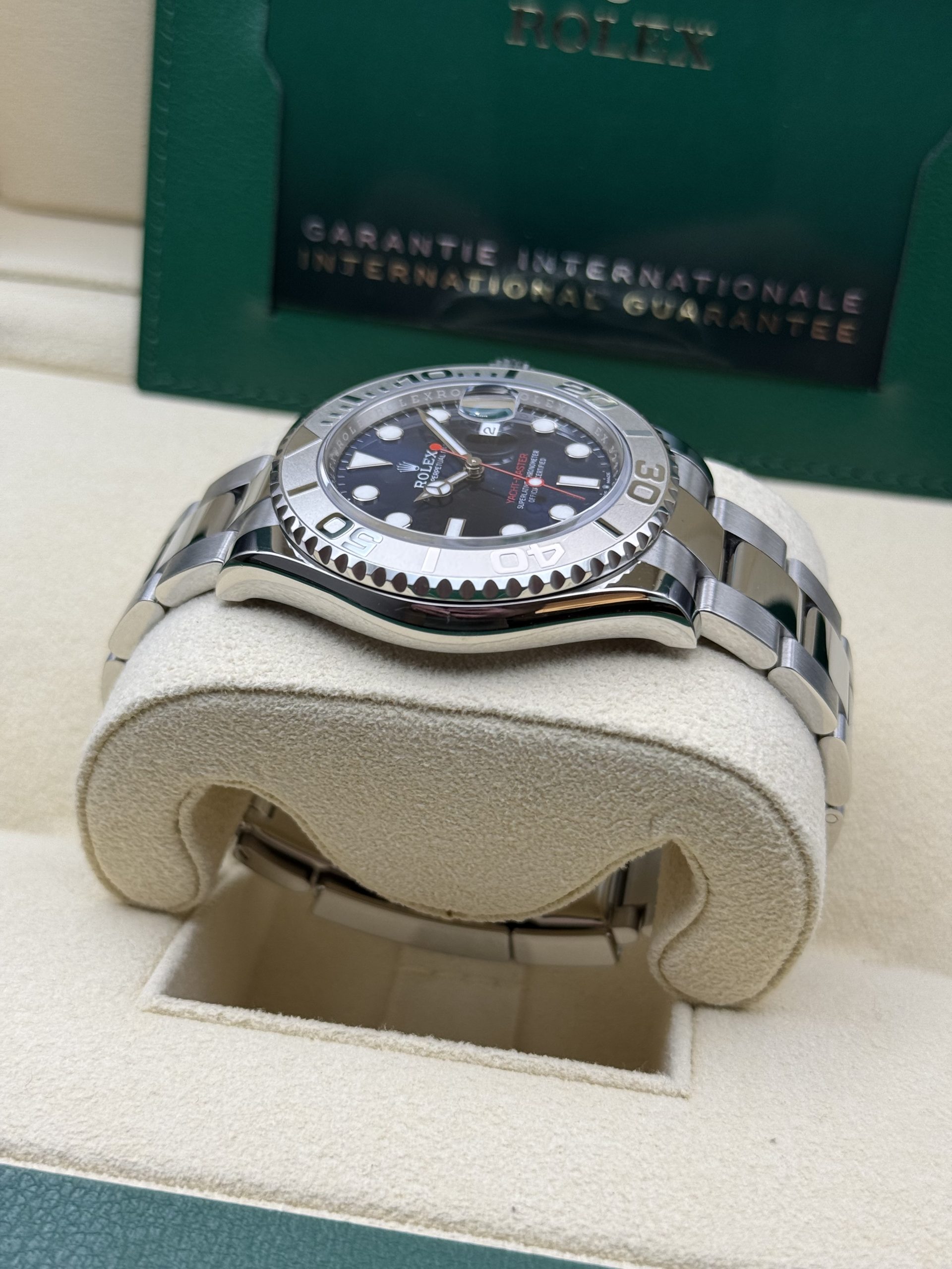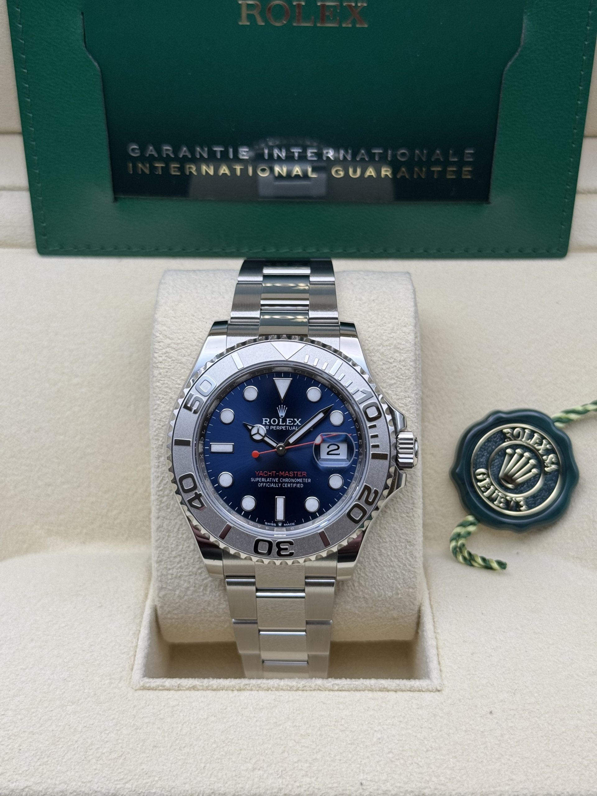 Introducing the Rolex Yacht-Master 40 with a captivating blue dial—a timepiece that seamlessly combines nautical flair with Rolex’s timeless elegance. This model features a sleek platinum bidirectional rotatable bezel and a sporty Oystersteel case, striking the perfect balance between sophistication and functionality. The sunburst blue dial exudes a sense of maritime adventure, complemented by luminous hour markers and hands for optimal readability. Powered by the innovative Caliber 3235 movement, the Yacht-Master 40 ensures precision and reliability in every moment. Whether you’re sailing the high seas or making a statement on land, this Rolex Yacht-Master 40 with a blue dial is a true symbol of luxury and maritime spirit, making it a must-have for discerning enthusiasts.