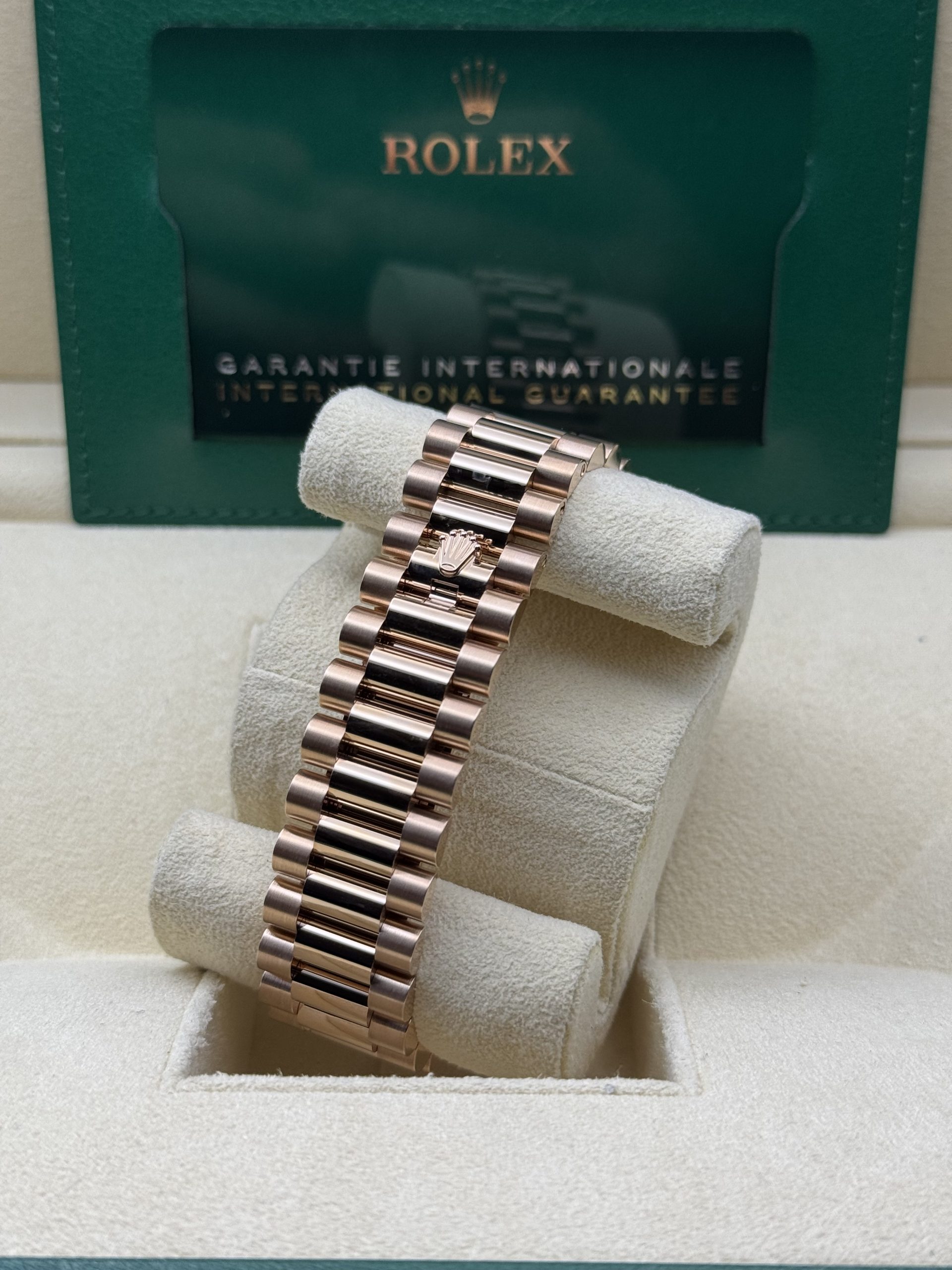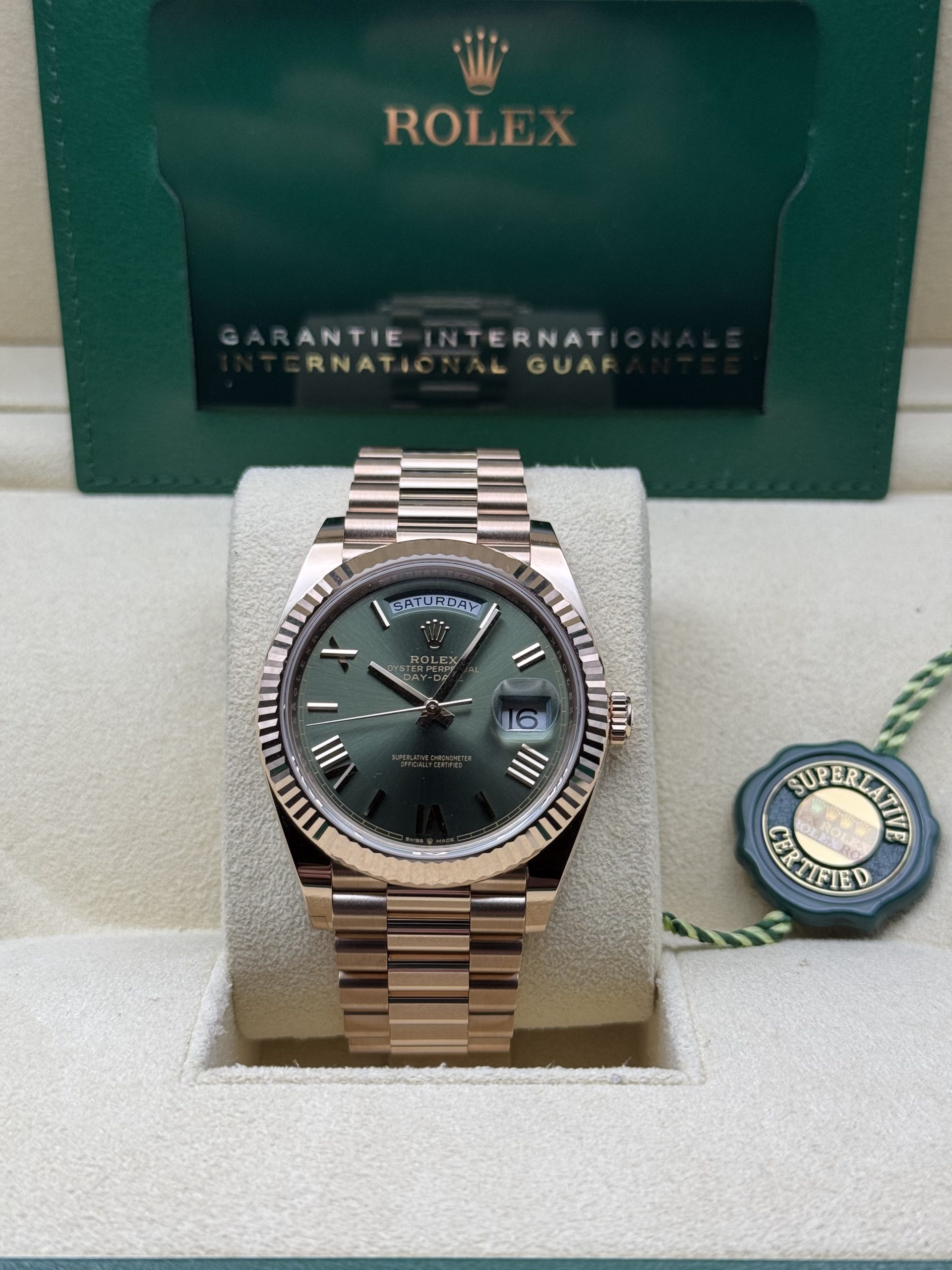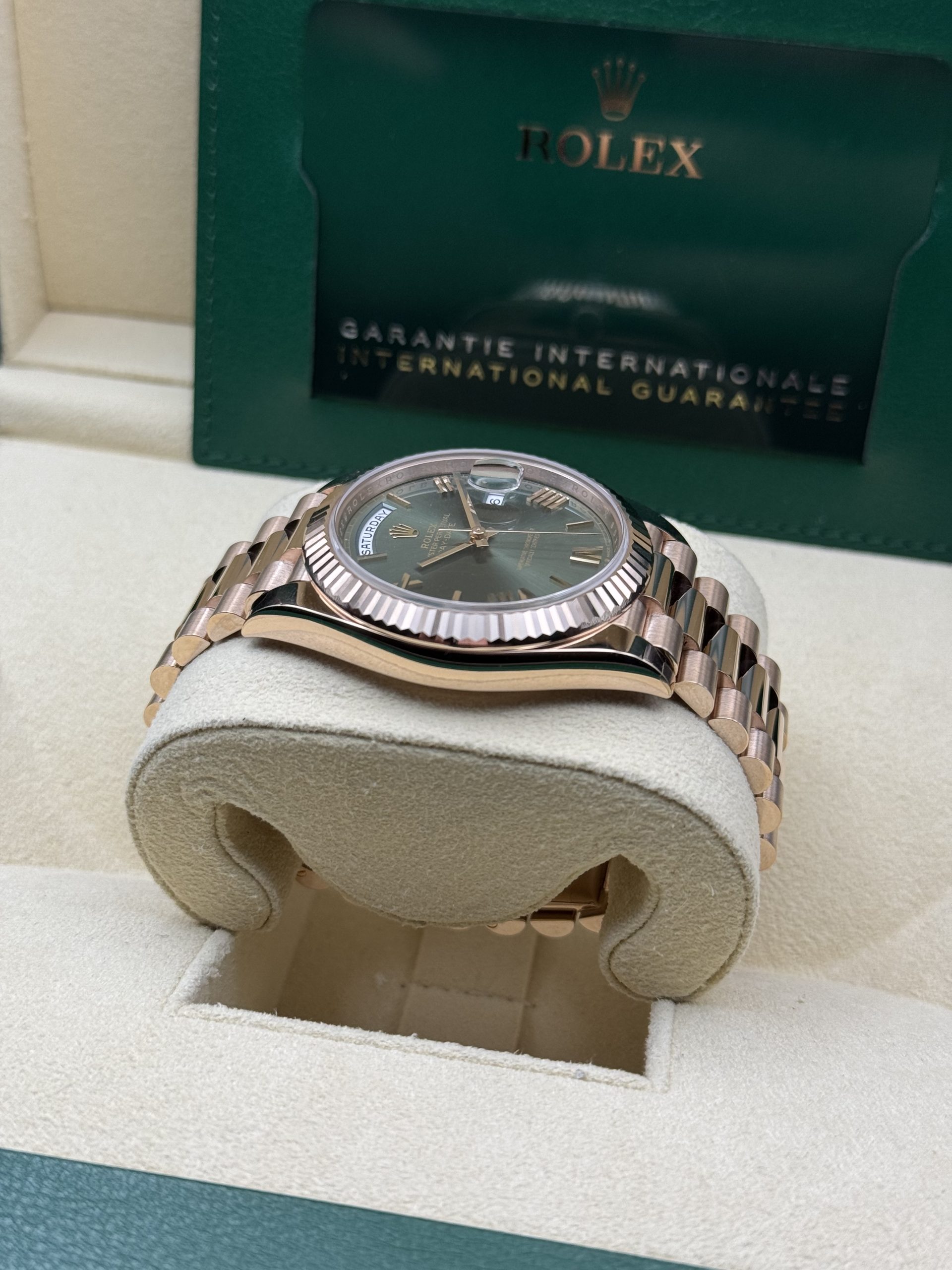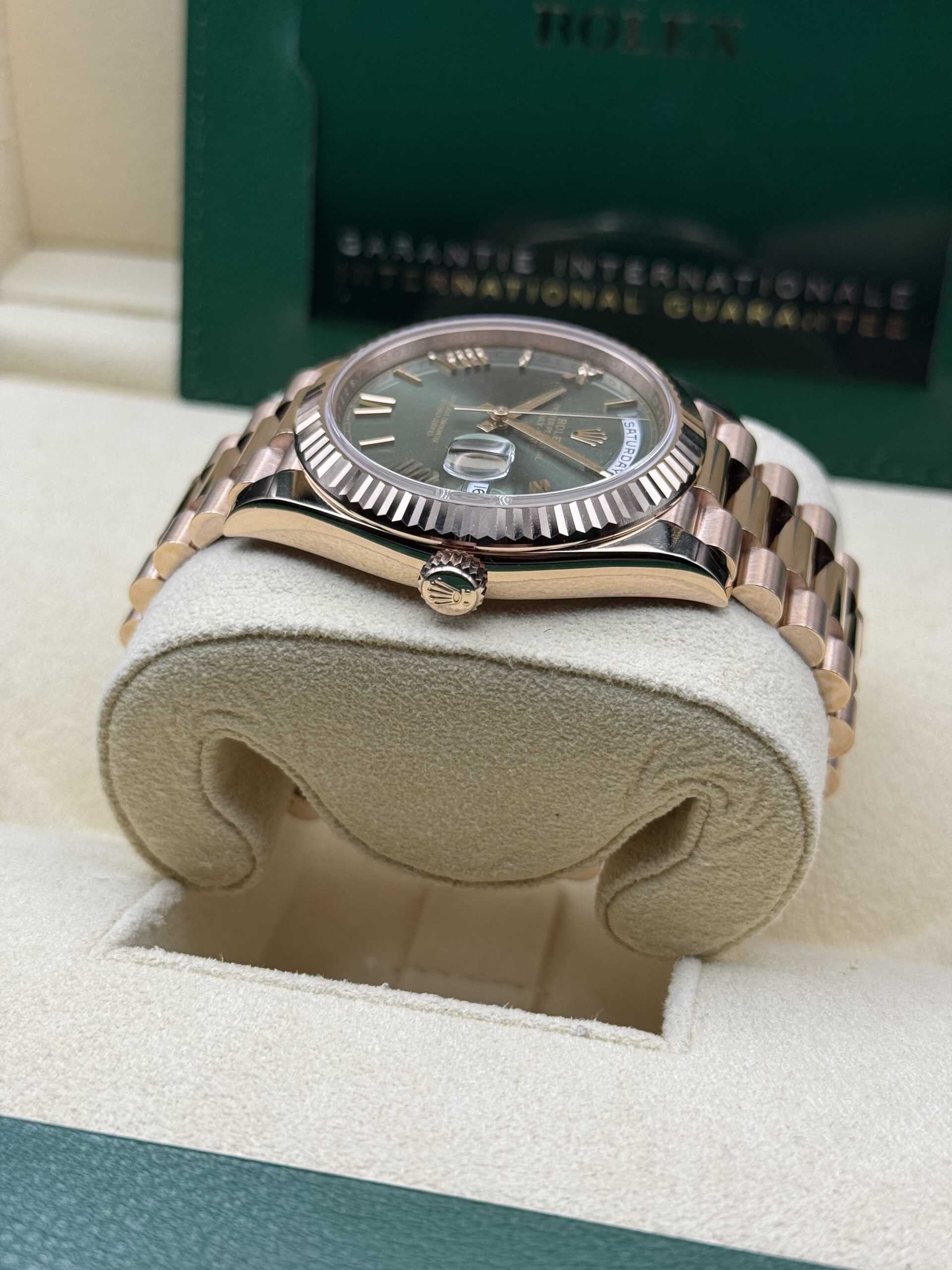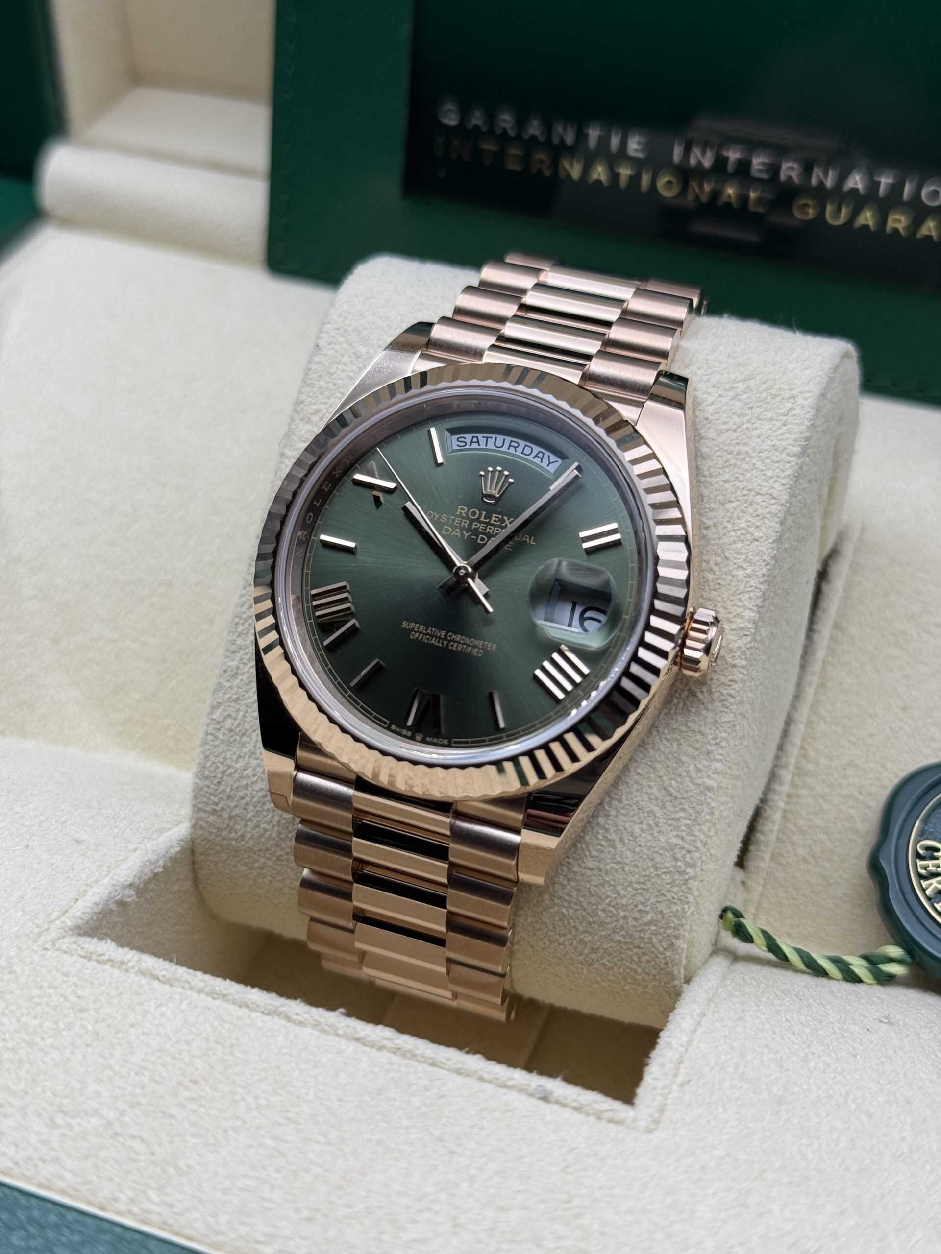 The Rolex Day-Date 228235, a luxurious timepiece that radiates opulence and sophistication. Crafted in exquisite 18k rose gold, this Day-Date model features a distinctive olive green dial, adding a touch of uniqueness to the iconic design. The President bracelet, a symbol of prestige, complements the elegant aesthetics, making it a statement of refined taste and unparalleled craftsmanship. The day and date indicators, displayed prominently on the dial, showcase Rolex’s commitment to functionality and precision. Driven by the Caliber 3255 movement, the Day-Date 228235 ensures exceptional accuracy and reliability. Elevate your wristwear with this exquisite Rolex Day-Date, a timeless symbol of success and prestige, where the allure of rose gold meets the richness of the olive green dial, creating a harmonious blend of luxury and style.
